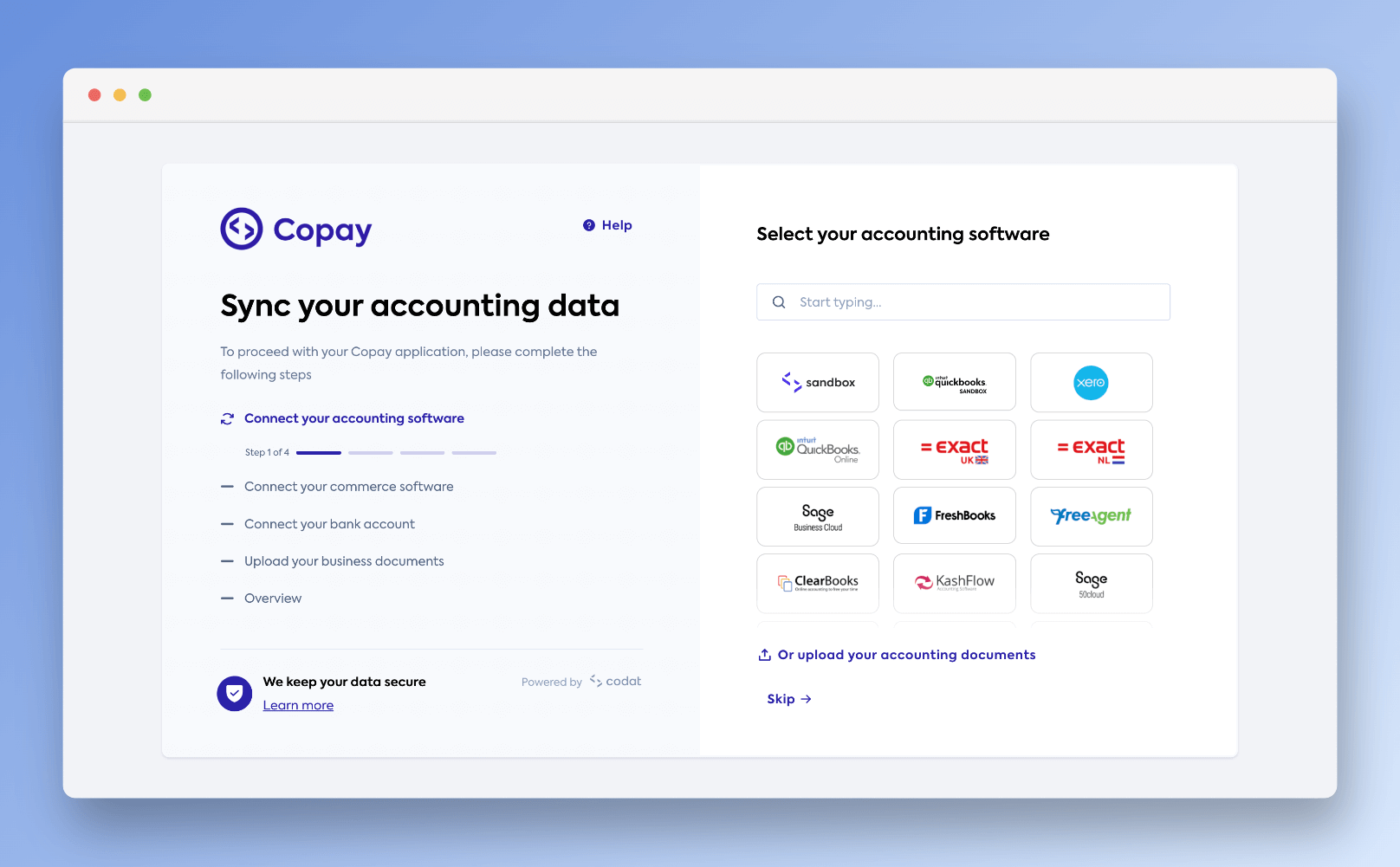 Curious where Codat's Hosted LinkLink The authorization flow that allows end users to connect their accounting, banking, or commerce platforms to your application via Codat. flow might fit in your customer's experience? See how a fictional fintech companyCompany In Codat, a company represents your customer's business entity. Companies can have multiple connections to different data sources. uses it in our demo.